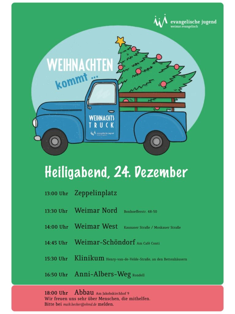 Ein weiteres Highlight im Jahr ist unser Weihnachtstruck. Gemeinsam mit anderen Jugendlichen organisieren wir einen Weihnachtstruck, welcher an Heiligabend an verschiedenen Stellen in Weimar herumfährt und dort Lieder spielt.